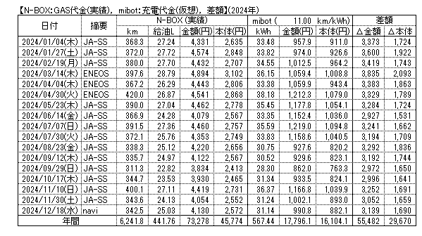 【N-BOX:GAS代金(実績),mibot:充電代金(仮想),差額】(2024年)