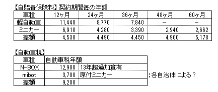 我家の N-BOX を mibot に換えた場合は自賠責、自動車税、重量税で 17,678円/年程度は安くなるようです。